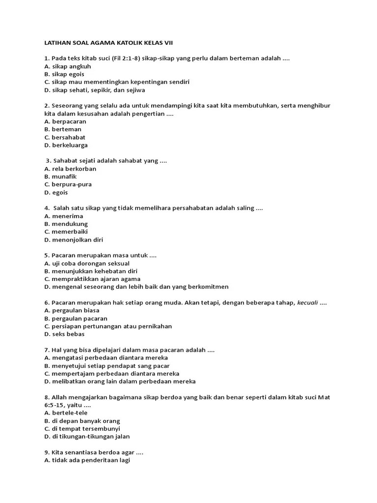 Semua orang yang dipanggil untuk menjadi anggota gereja katolik adalah. Contoh soal pendidikan agama islam pai kelas 7 lengkap dengan kunci jawabannya a. Uas semester ganjil, penilaian akhir semester pas mengacu pada penyusunan soal hots. Untuk soal nomor 1 sampai dengan 45 pilihlah jawaban yang paling tepat dengan caramemberi tanda silang (x) pada huruf a,b,c atau d di lembar . Pendidikan agama katolik & budi pekerti.